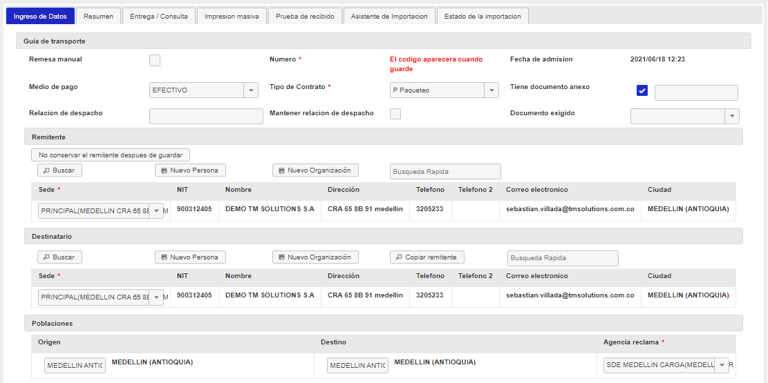 • Se ajusta el sistema para que siempre en la guía de transporte tome el cliente como el remitente del envío.