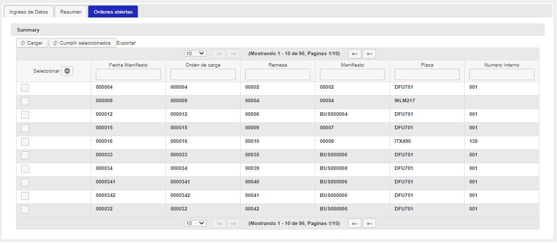 • Se realizo un nuevo desarrollo para que se puedan ver todas las órdenes de carga que tienen remesa sin cumplir, este quedo en el formulario orden de carga en una tercera pestaña. En esa misma pestaña puede seleccionar los viajes que desea cumplir y darle cumplir. El proceso realizado por esta pestaña es simplemente informativo y no es un cumplido que se envíe al ministerio, como si lo hace el cumplido de la remesa.